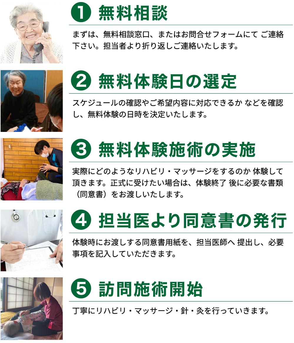施術内容やご利用方法についてのご質問がございましたら、どうぞお気軽にお問い合わせください。ご利用者様お一人おひとりのご状況や、施設の環境などに合わせて、最適な施術プランをご提案させていただきます。