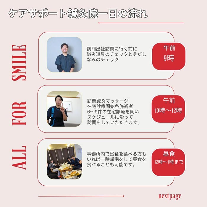 求人者の皆さまへ、訪問鍼灸マッサージの仕事の1日の流れをご紹介します♪